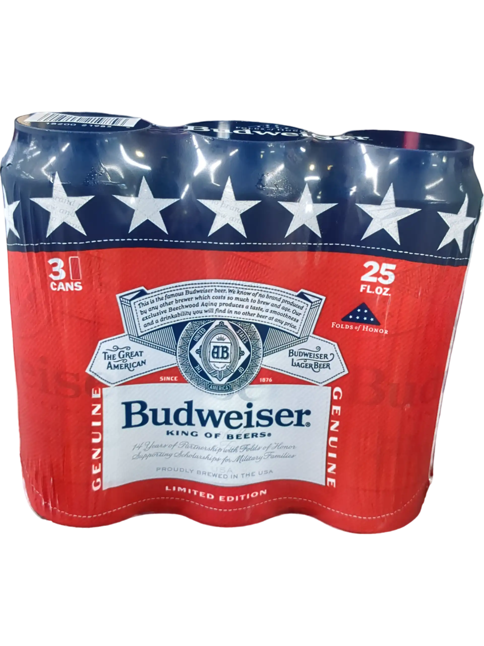 Three 25 fl oz cans of Budweiser Lager. Must be delivered to someone with valid ID.